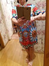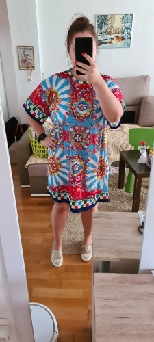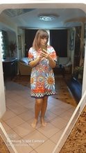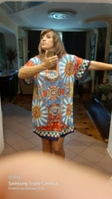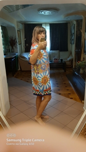 Delivery to Moscow month. Tunic of pleasant synthetic jersey with a small % cotton. At 52-54R. (105-90-114) the village is not obtyag, on the growth of 170 cm. At 10 cm. Above the knee. The color corresponds to the photo of the store.